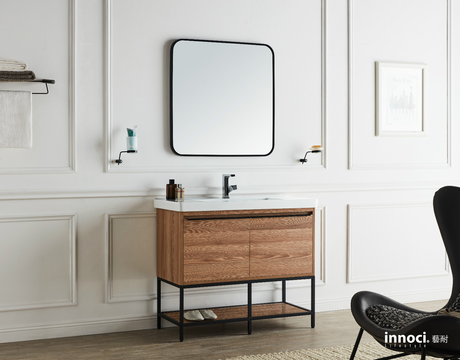 来自于自然的灵感,浴柜的木框架与家具洗脸盆相搭配,红色木纹的家具饰面设计,在现代生活中增加自然气息,让生活更舒适。艺耐陶瓷盆系列台面搭配,更进一步展现出台面出色的设计灵活性。吉美尼系列浴室柜可搭配艺耐脸盆,共有七种不同产品搭配,同时还有挂壁式和落地式可供选择。