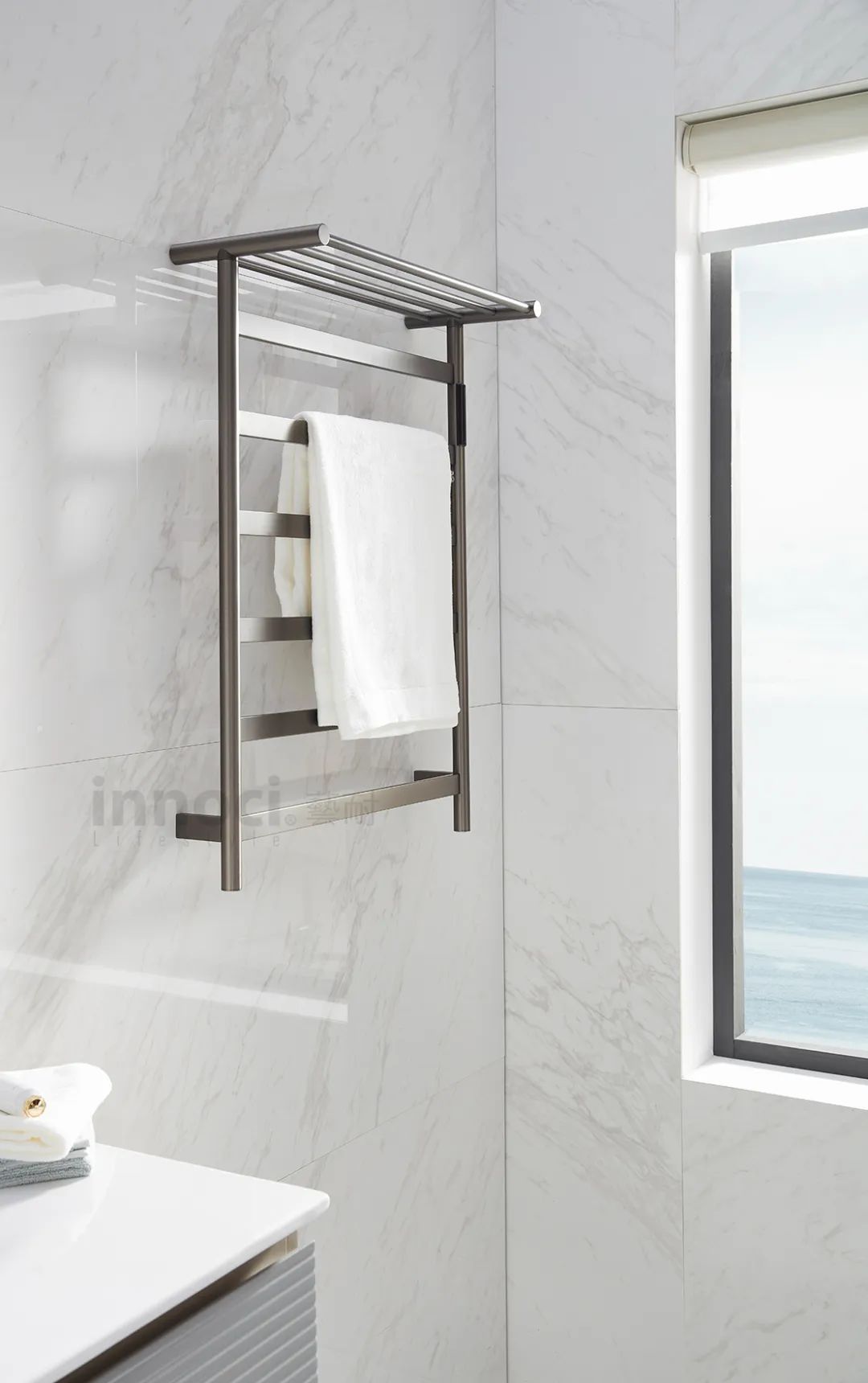 钛空灰色电热毛巾架,采用碳纤维发热,通过快速烘干的方式避免细菌滋生,有效避免了毛巾因为潮湿产生霉菌。